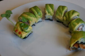Caterpillar-rulla on pohjimmiltaan käänteinen Dragon-rulla. Avokado ulkopuolella, ankerias ja tempurapaistetut katkaravut sisällä. Todella herkullista.