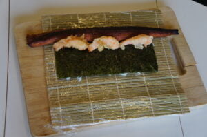 - Flip the nori over, and place the shrimp and avocado across the nori
