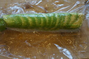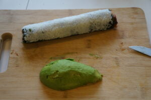 - Cover the roll with plastic tape. Use the sushi rolling mat to tighten the avocado to the roll.