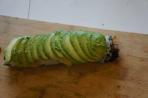 - Slice half an avocado in thin slices and place them on on the roll to fully cover it